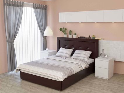 Кровать комплектуется основанием (буковая или металлокаркассная рама) с подъемным механизмом, под которым находится вместительный бельевой ящик для хранения сезонных вещей и постельных принадлежностей.