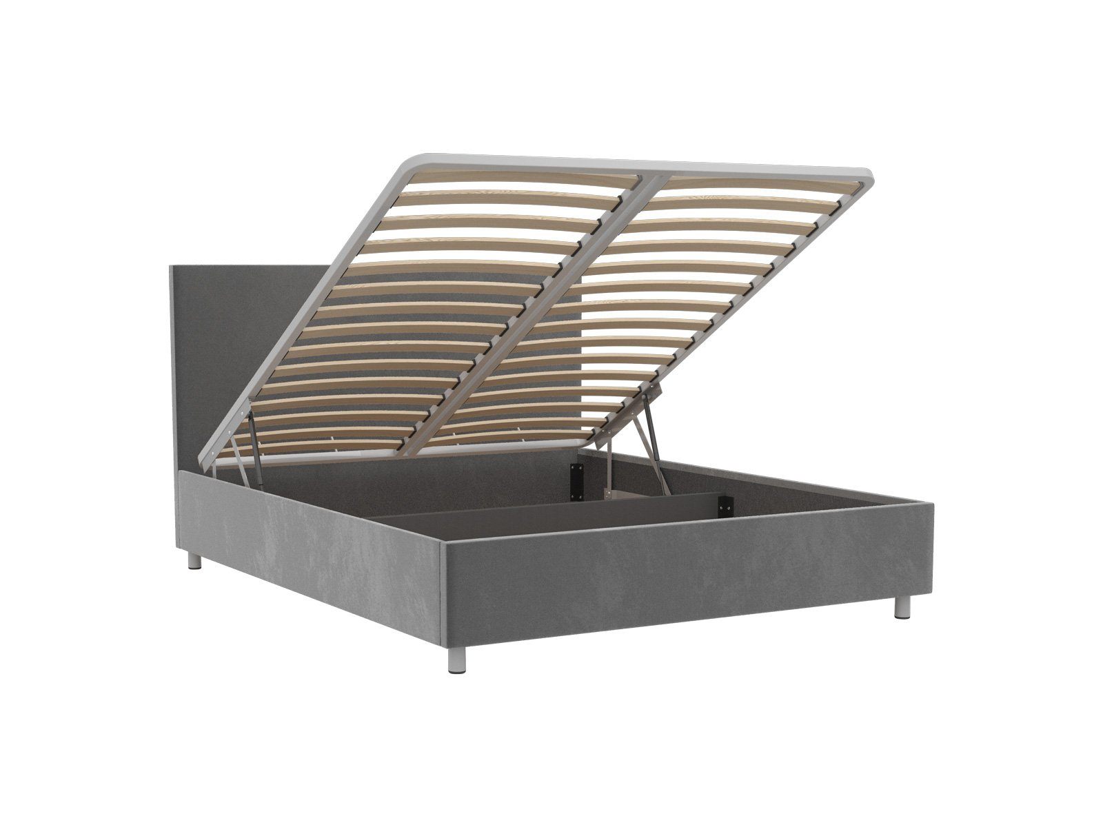Кровать оснащена подъемным основанием с ламелями, под которым находится вместительный ящик для хранения. Рекомендуемая высота матраса от 13 см, вес матраса до 50 кг.