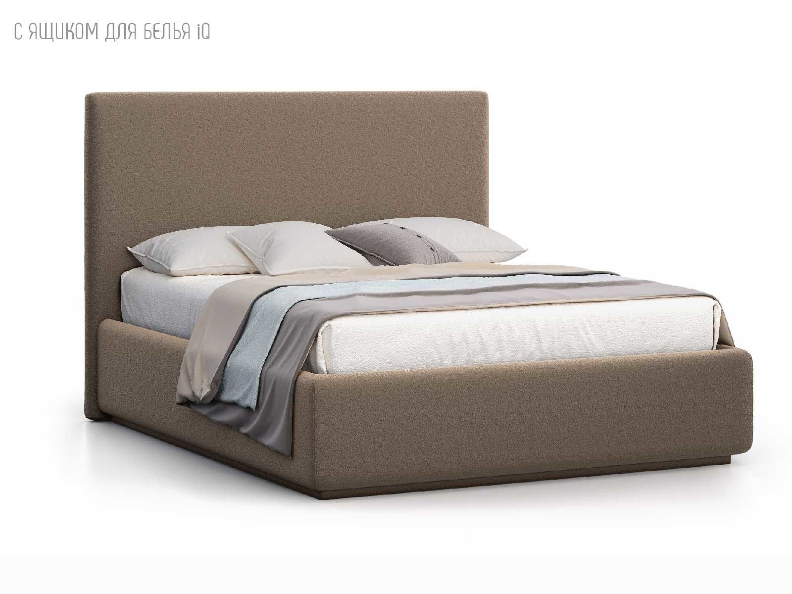 Кровать укомплектована IQ с подъемным механизмом и ящиком для белья без дна (дополнительная платная опция - дно к ящику IQ из HDF (ХДФ). Каркас кровати на цоколе, декоративный чехол на цоколе съёмный. Глубина ящика для белья - 30 см, без ограничения нагрузки на ящик.