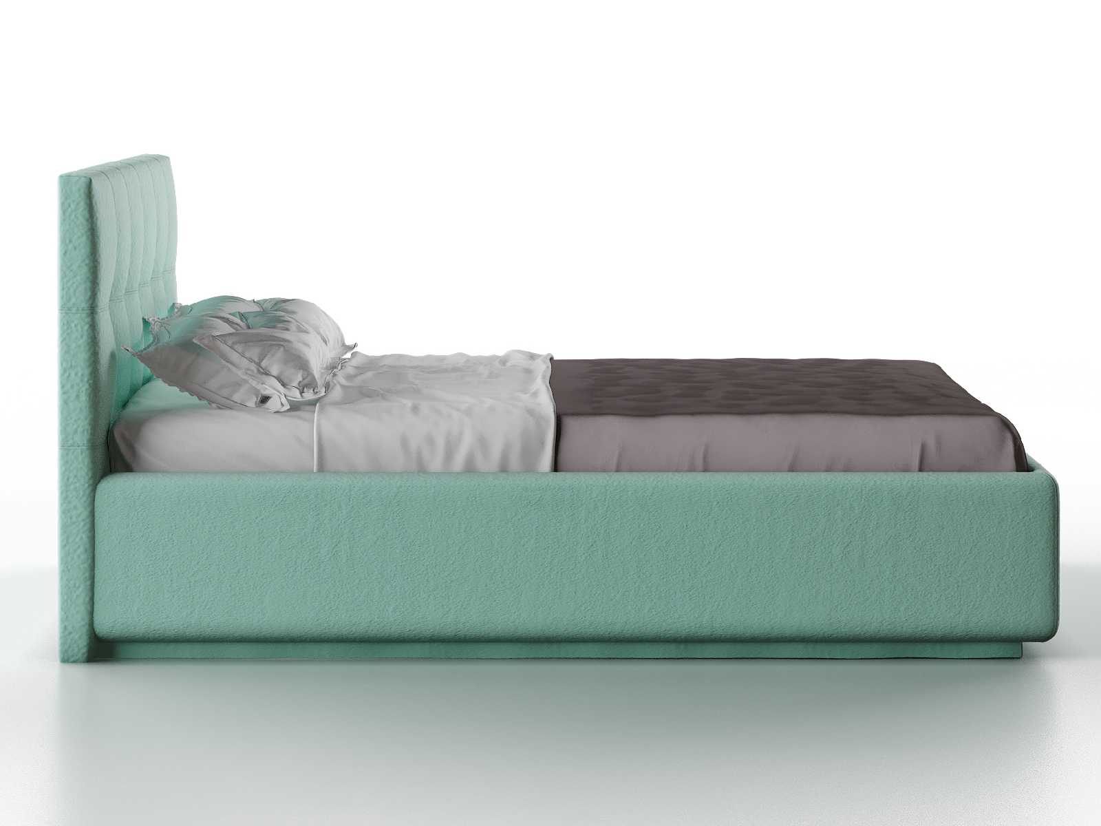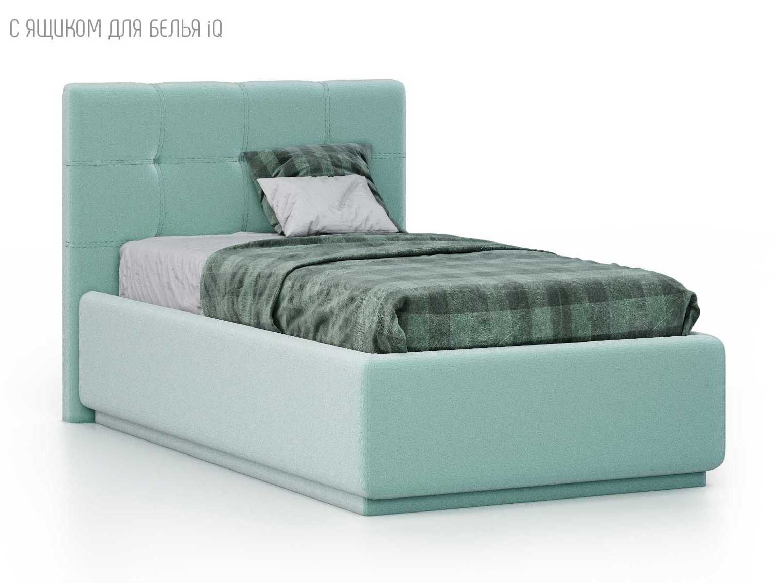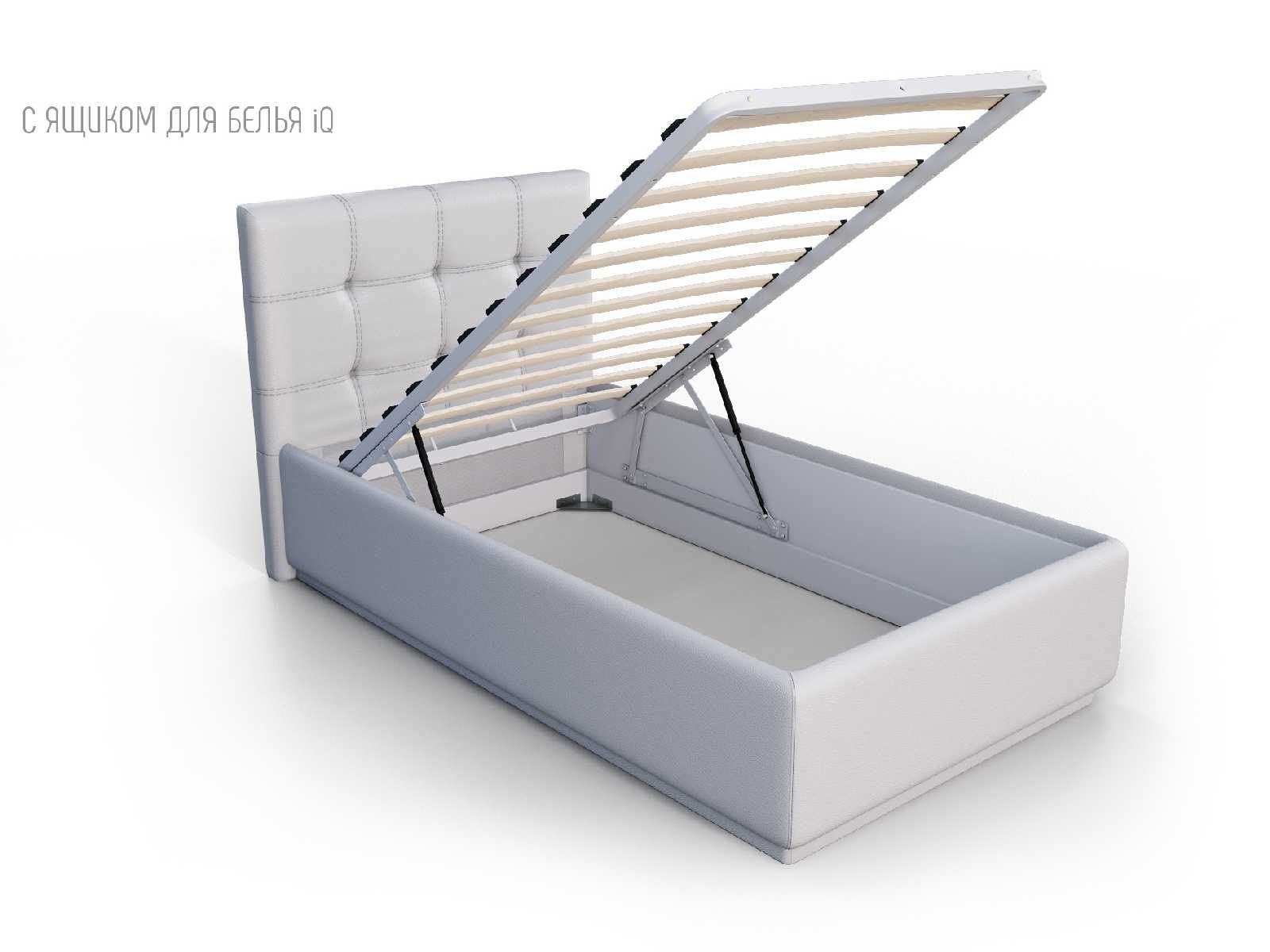 Кровать укомплектована IQ с подъемным механизмом и ящиком для белья без дна (дополнительная платная опция - дно к ящику IQ из HDF (ХДФ). Каркас кровати на цоколе, декоративный чехол на цоколе съёмный. Глубина ящика для белья - 30 см, без ограничения нагрузки на ящик.