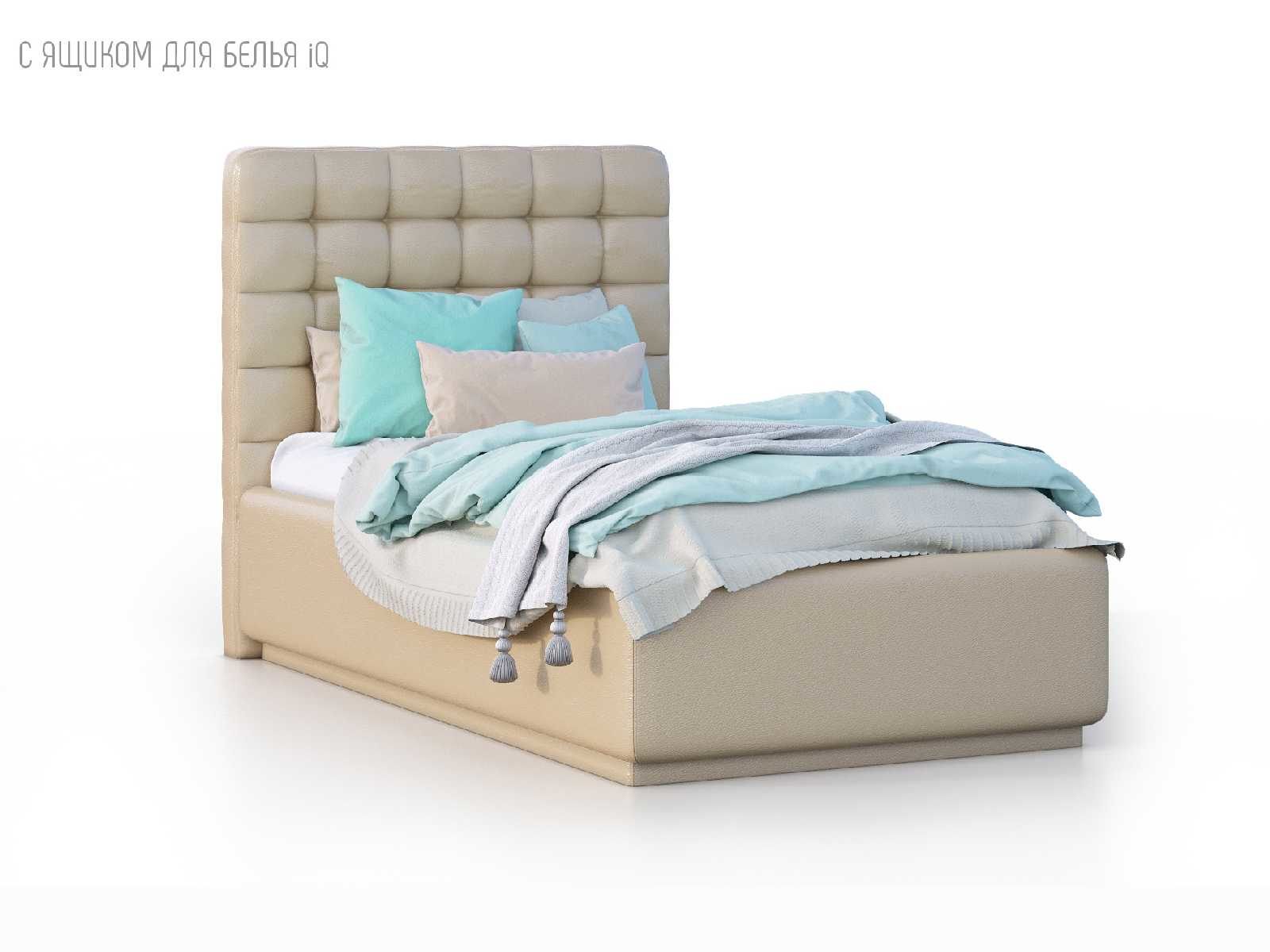 Кровать укомплектована IQ с подъемным механизмом и ящиком для белья без дна (дополнительная платная опция - дно к ящику IQ из HDF (ХДФ). Каркас кровати на цоколе, декоративный чехол на цоколе съёмный. Глубина ящика для белья - 30 см, без ограничения нагрузки на ящик.