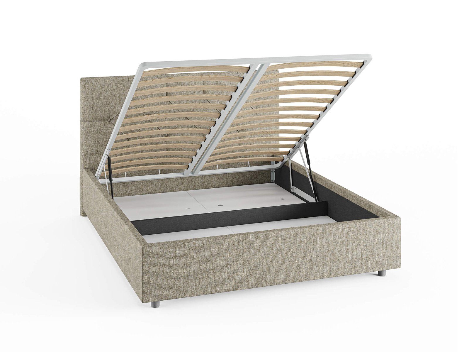 Кровать комплектуется металлическим основанием и подъемным механизмом со вместительным бельевым ящиком. Дно бельевого ящика легко сдвигается для обеспечения уборки под кроватью.
