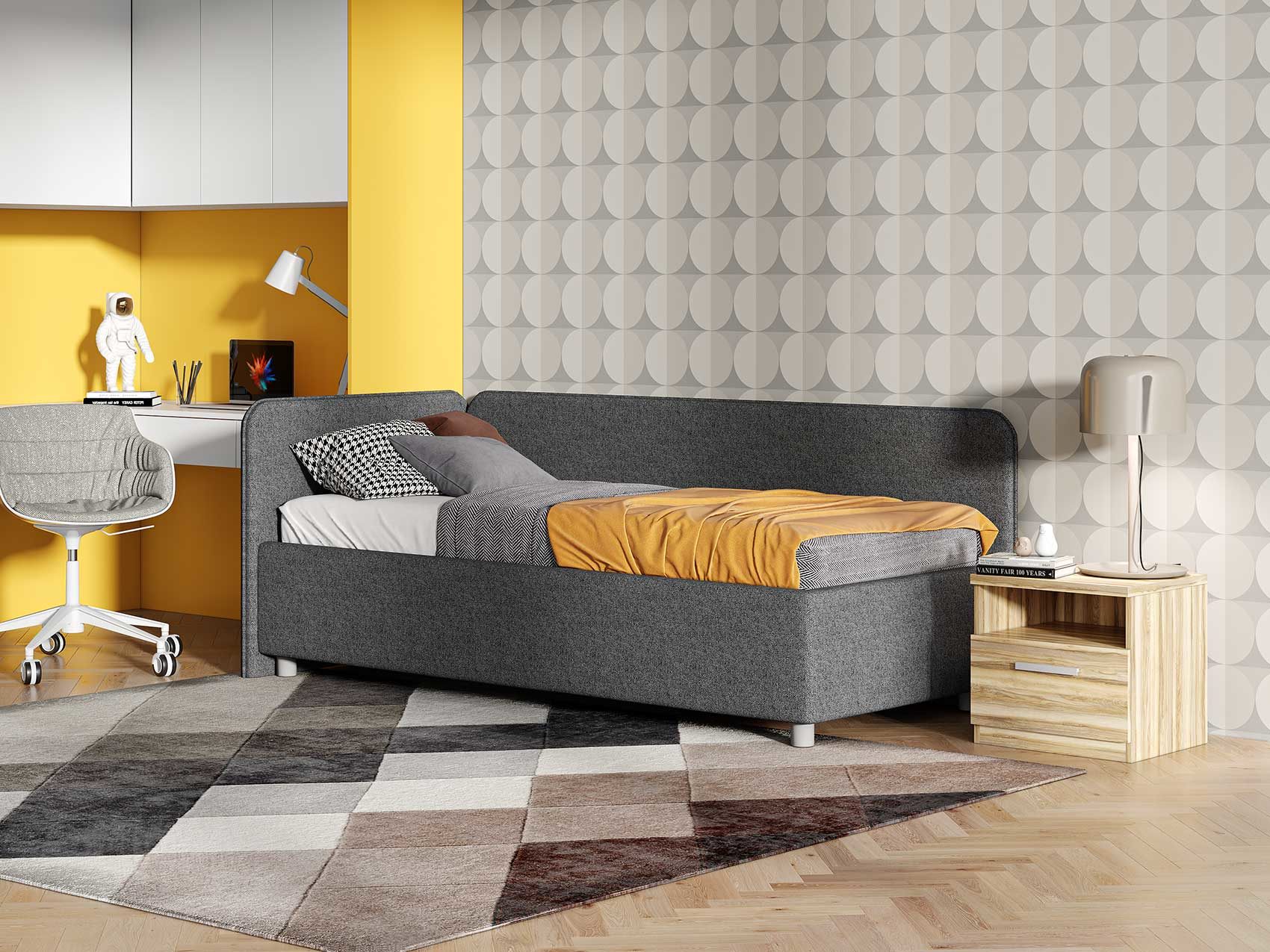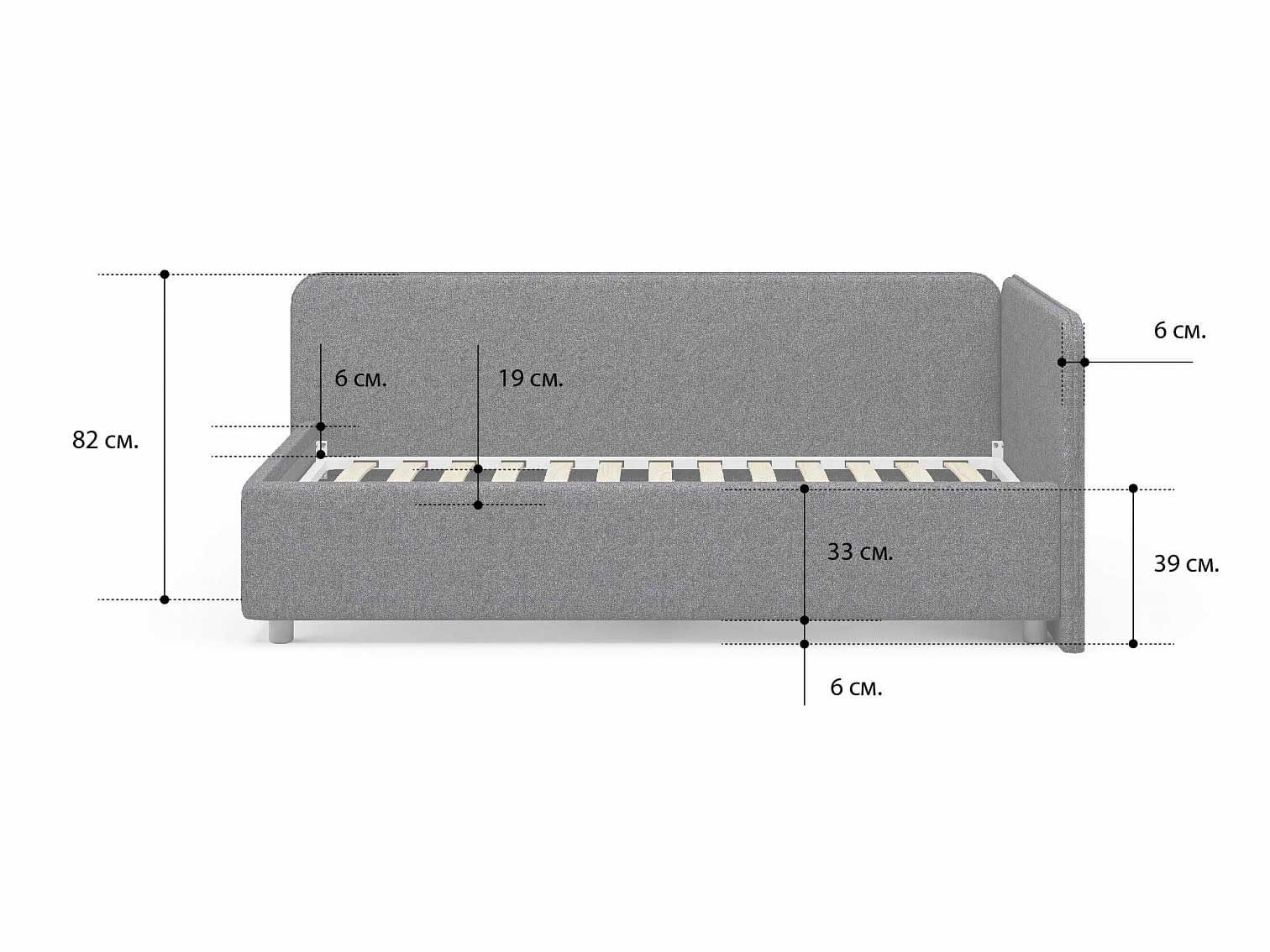 Односпальная кровать в современном стиле. Кровать-софа с одной боковой спинкой. Идеально подходит для квартир с небольшой площадью, детских и подростковых спален, гостевых комнат. Боковую спинку кровати можно изготовить на выбор на правую или левую сторону. Модель изготовлена из ДСП. При необходимости, кровать можно укомплектовать подъемным механизмом с бельевым ящиком.
