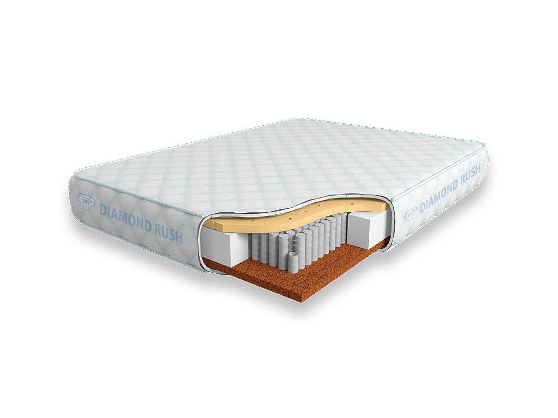 Матрас Diamond Rush Cocos Contrast 1440DR имеет в своей основе независимый пружинный блок 1440, состоящий из пружин диаметром 3-4 см. Это разносторонний матрас с контрастными по жесткости материалами. В этой модели используются натуральный латекс с перфорацией и латексированная кокосовая койра.