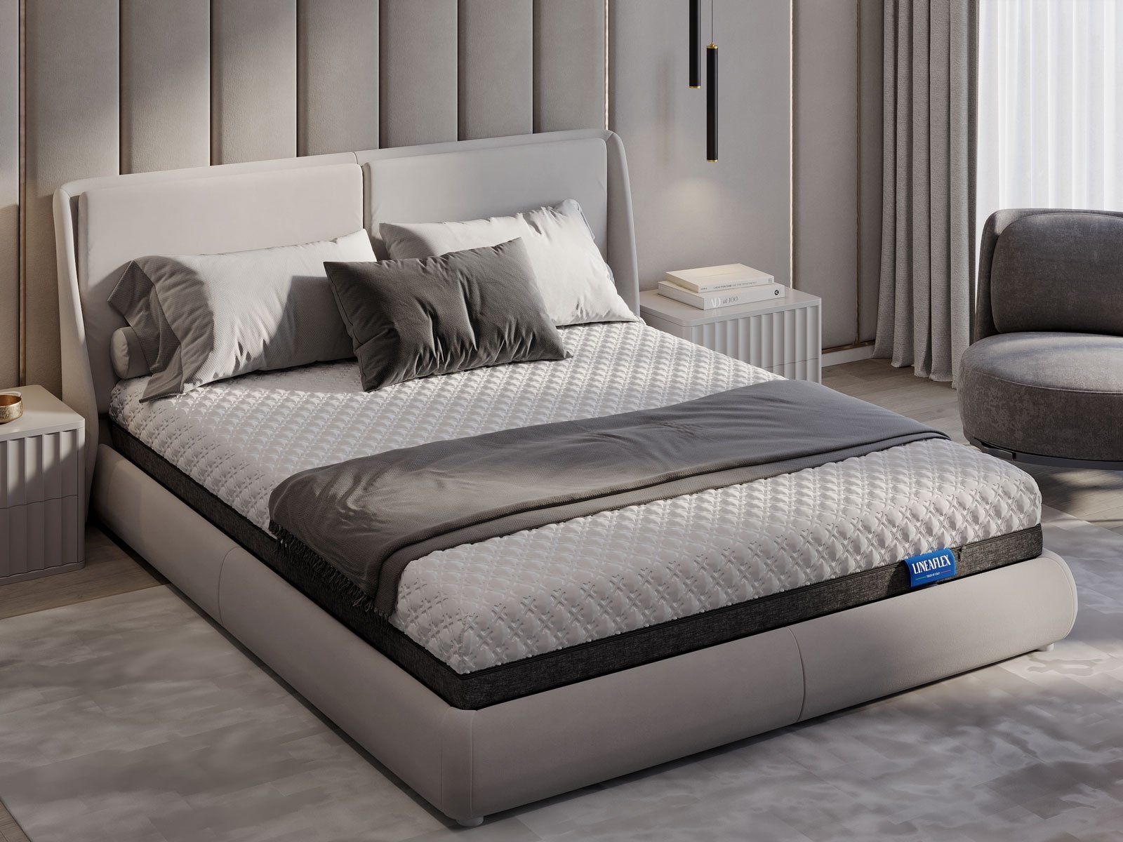 Матрас оснащается съёмным чехлом SkyTouch Black&White. Премиальный трикотаж чехла состоит из двух половин. Первая сторона - это плотный трикотаж без стежки, вторая сторона - это премиальный трикотаж с массажными подушечками. Чехол обладает вшивной молнией, поэтому при желании может быть снят и постиран при температуре до 60 градусов.
