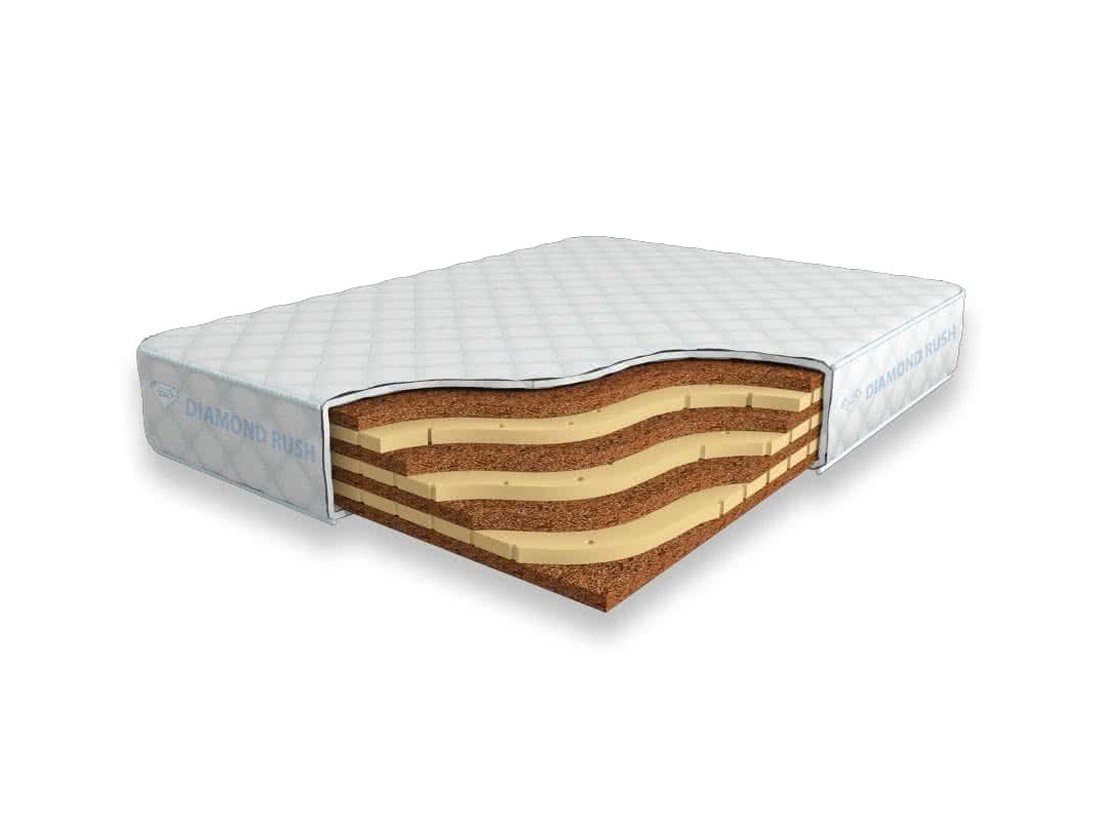 Матрас Diamond Rush Super Mix Cocos 21 DR является беспружинным, т.е. не имеет в своей основе пружинного блока. В его состав входят одно или несколько чередований слоев латексированной кокосовой койры и натурального латекса с перфорацией. Все слои по 3 см. Такая модель матраса относится к среднежестким и обладает ортопедическим эффектом.