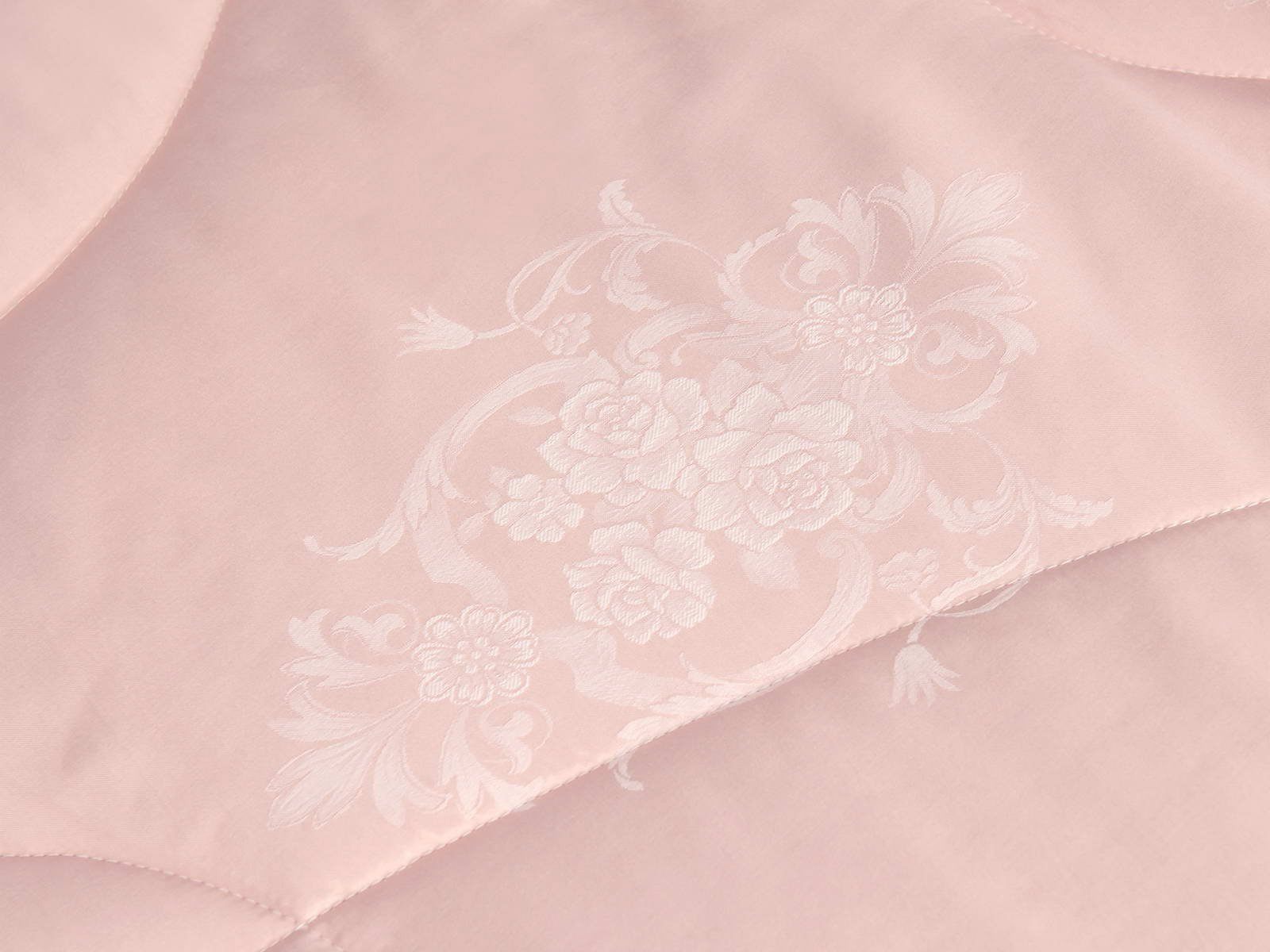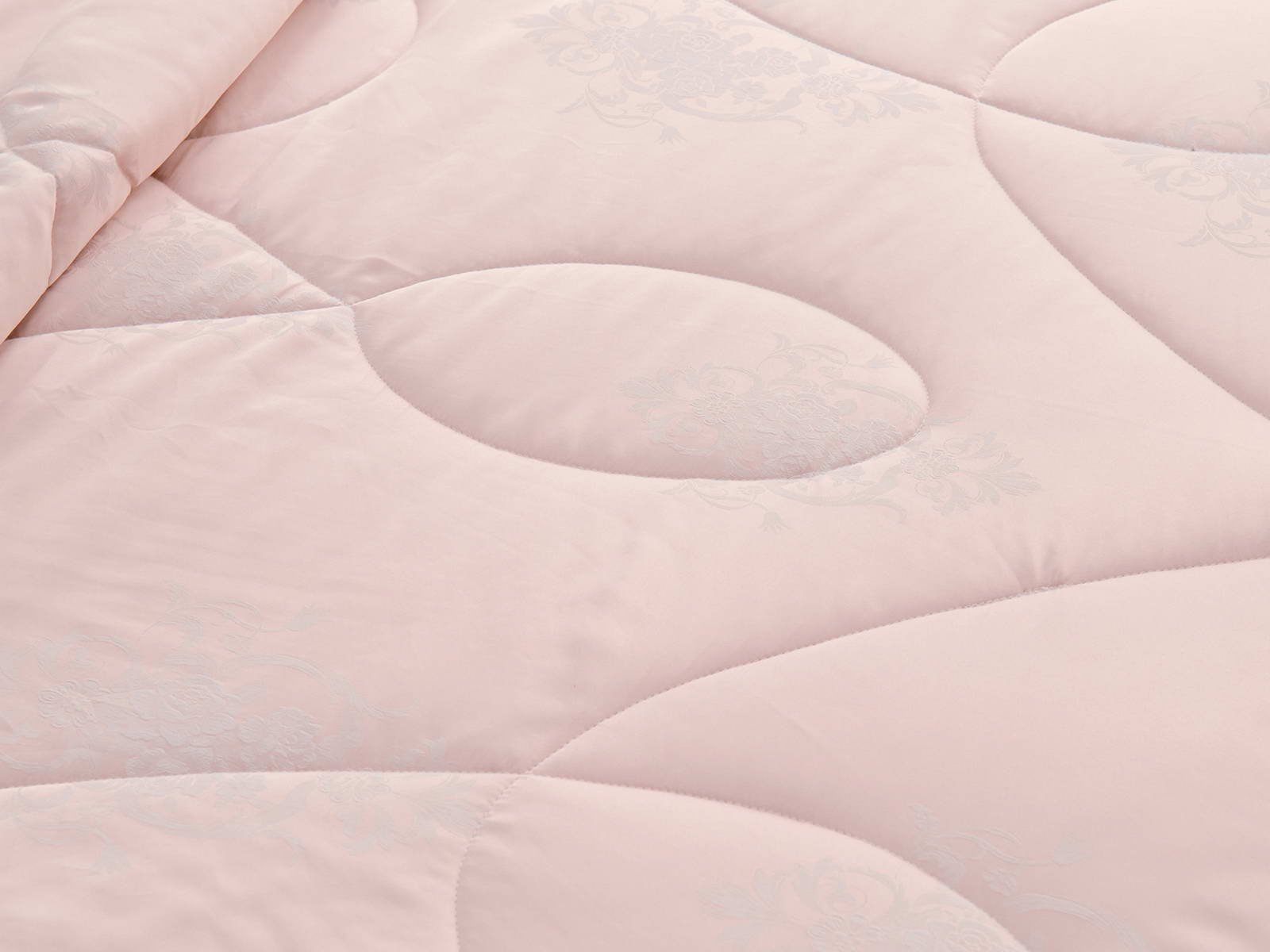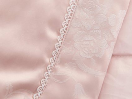 Одеяло представлено в модных цветах этого сезона: пудра, персик, крем, серый, карамель. Такие оттенки придадут нотки изысканности и утонченности вашей спальне. Изделие украшает декоративная стежка, создающая на одеяле прямые, изогнутые линии и окружности. С помощью специального станка на ткань нанесен уникальный повторяющийся рисунок в винтажном стиле. Вы можете выбрать узор на свой вкус: небольшой лавровый венок, венчающий корону, или одну из цветочных композиций среднего размера. По широкому канту в тон изделию проходит деликатная полоска светлого кружева.