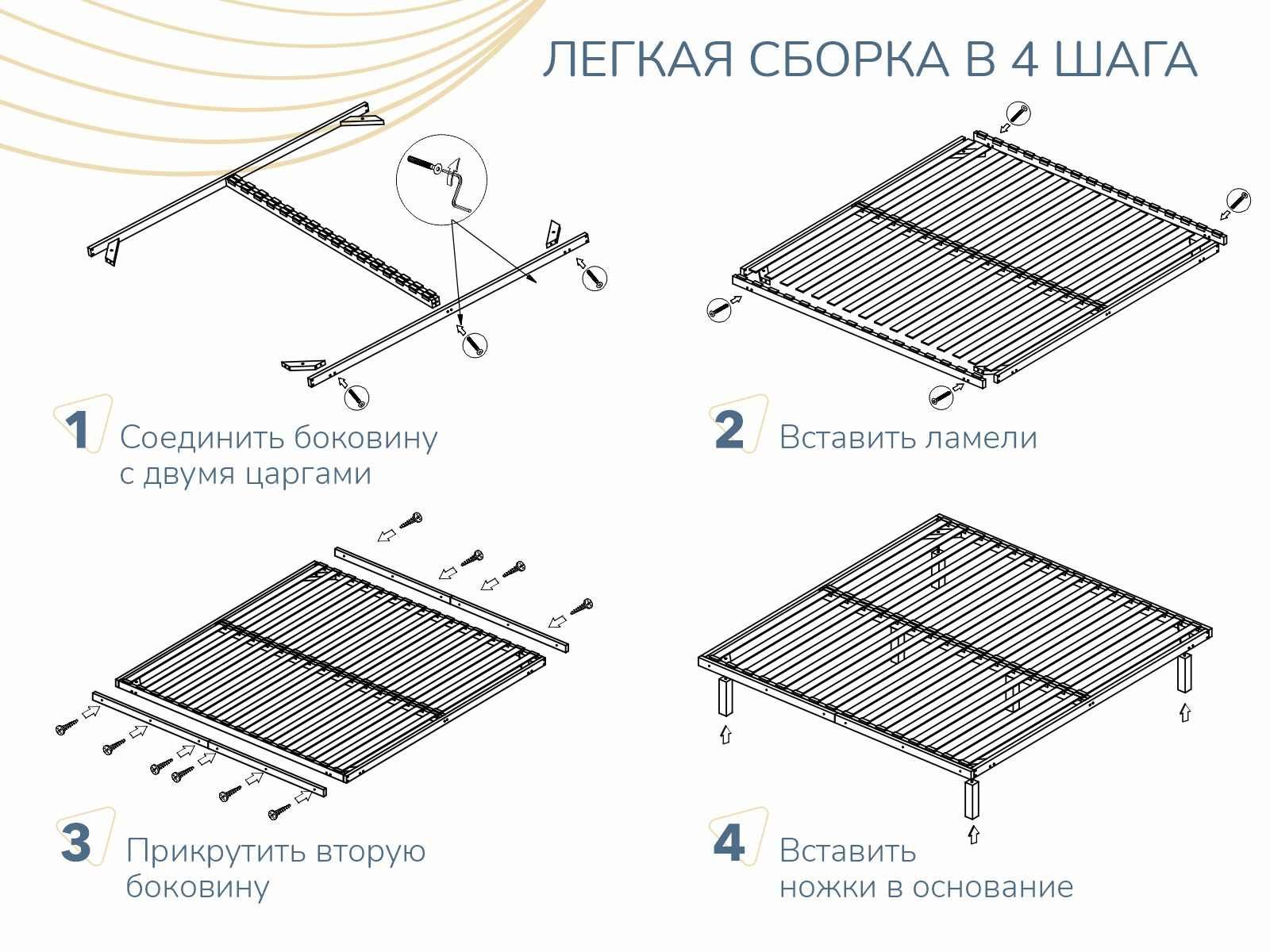 Деревянное основание на ножках для любых беспружинных матрасов и матрасов с пружинным блоком Bonnel и TFK. Рама изготовлена из клееной фанеры из березы сечением 50х25мм. Латы березовые, латодержатели пластиковые. Ножки прямоугольного сечения.
