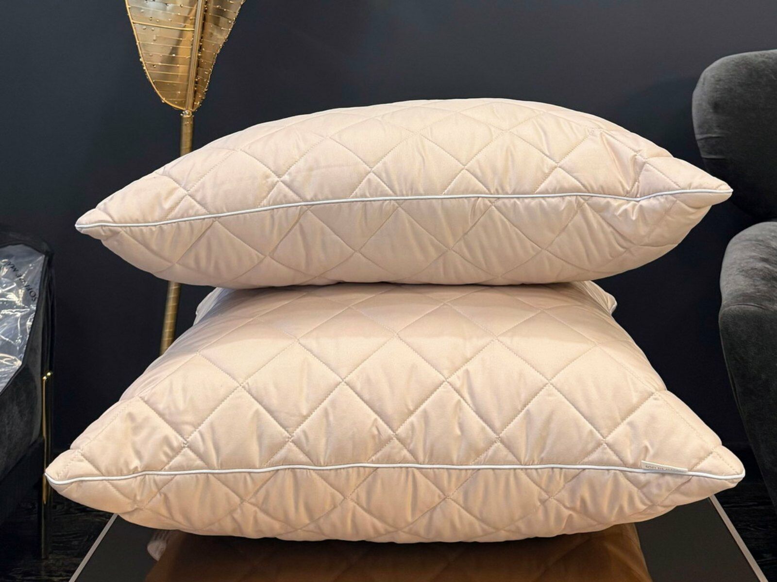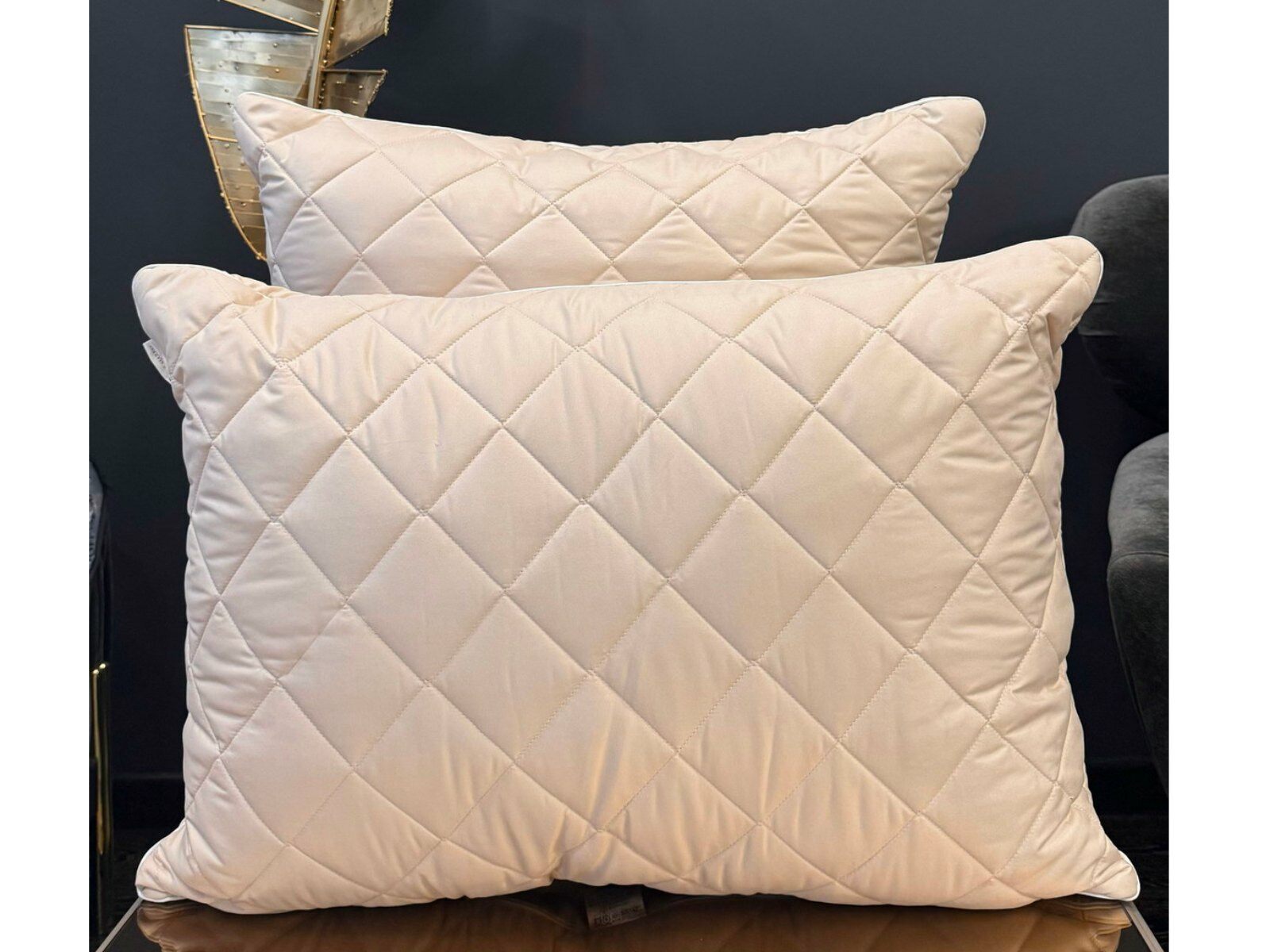 Наполнителем для подушек служит искусственный лебяжий пух, он обладает отличной формоустойчивостью, не сбивается в комки и прост в уходе. Особенность данной модели - уникальная стежка «ромбы», которая хорошо переносит ежедневную эксплуатацию, без потери своих качеств.